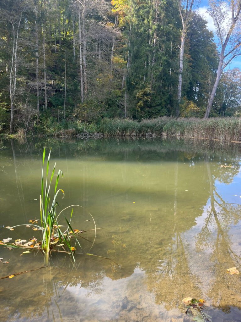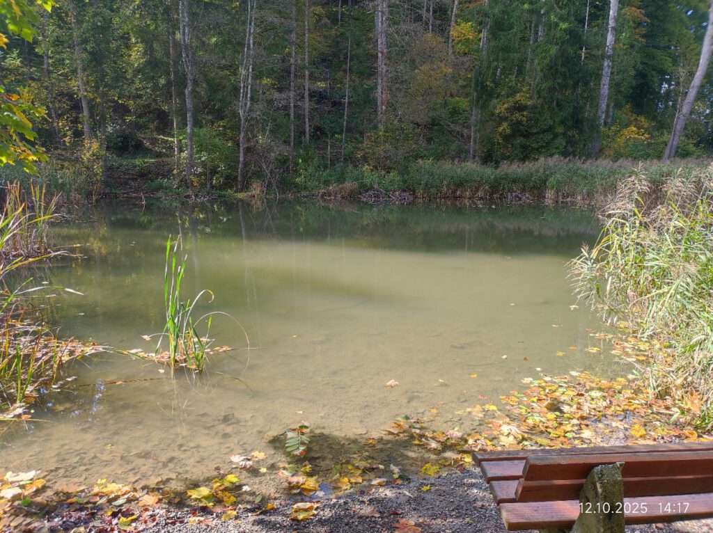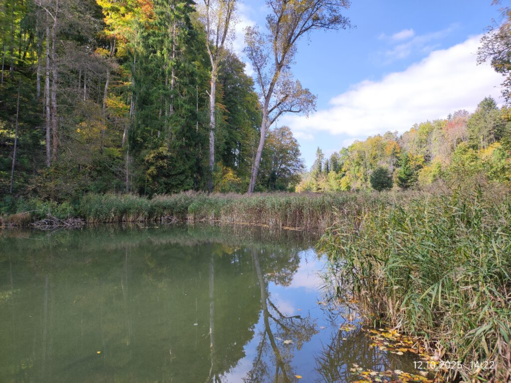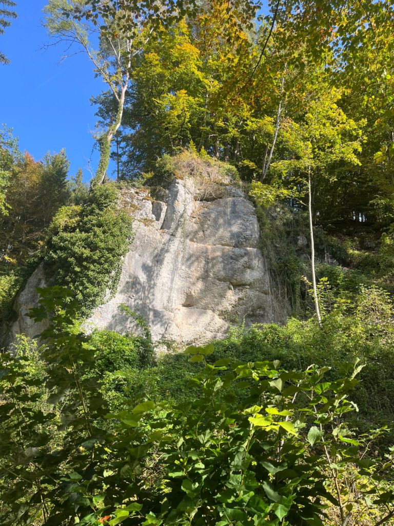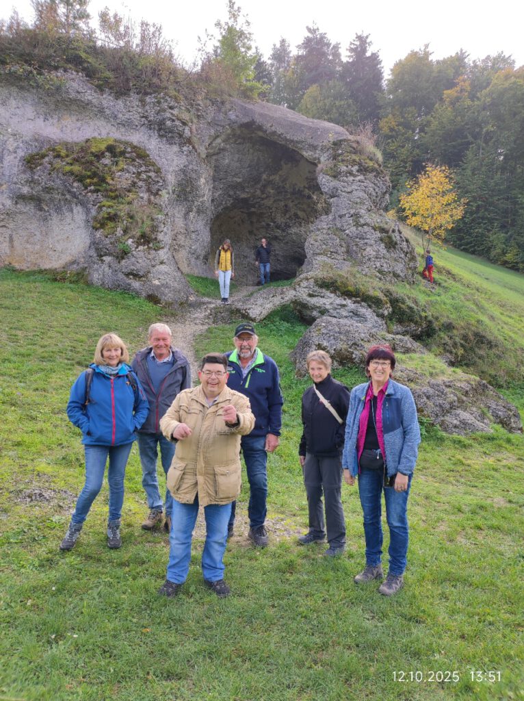 Vom Parkplatz bei der Gemeindehalle am Ortseingang wanderten wir zunächst hinunter zum Eiszeitpark. Auf mehreren Infotafeln am Petersfelsen konnten wir uns ein Bild machen wie es hier vor ca. 15000 Jahren zuging. Der Petersfelsen war eine Jagdstation von Rentierjägern. Wenn die Rentierherden im Herbst über die Hegaualb in schneeärmere Gebiete zogen, passierten sie auch das Brudertal das sich hier verengt. In die Gnirshöhle konnten wir leider nur durch ein Gitter hineinschauen. Im weiteren Verlauf des Tals kamen wir an einem schönen Teich vorbei bevor es wieder durch herrlich bunten Laubwald hinauf auf die Höhe ging. Wir hatten es nicht eilig sondern genügend Zeit zum Verweilen in der Sonne. Der Schlussteil führte wiederum durch idylische, dörfliche Landschaft bis zum Gasthaus Rigling welches immer noch Weilheimer Bier ausschenkt. Hier wurde bei einem Wurstsalat die Wanderung beendet.